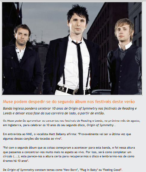 Que palhaços. Depois do absurdo último disco e do aborrecido concerto do Atlântico, esta notícia para mim chega: os Muse acabaram. Sigam, sigam, não há nada para ver.